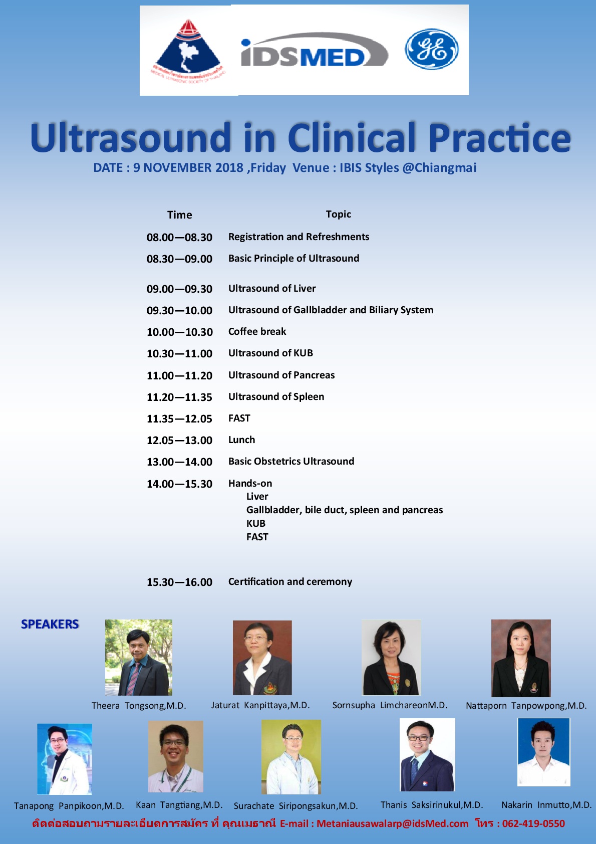 การประชุมเชิงปฏิบัติการ ครั้งที่ 3 ประจำปี 2561 เรื่อง "Ultrasound in Clinical Practice" โดยสมาคมอัลตร้าซาวด์ทางการแพทย์แห่งประเทศไทย ร่วมกับ บริษัท ยีอี เมดิคอล ซิสเต็มส์ (ประเทศไทย) จำกัด และบริษัท ไอดีเอส เมดิคอล ซิสเต็มส์ (ประเทศไทย) จำกัด จะจัดขึ้นในวันศุกร์ที่ 9 พฤศจิกายน 2561 ณ โรงแรม IBIS Styles Chiangmai จังหวัดเชียงใหม่